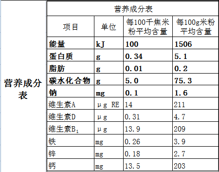 配料表 大米、白砂糖、全脂乳粉、小米粉(3%)、乳清蛋白(1%)、玉米粉(1%)、葛根粉(1%)、淮山粉(2‰)、焦磷酸铁、氧化锌、碳酸钙、醋酸维生素A、胆钙化醇、盐酸硫胺素、乳双歧杆菌(出厂里时不少于1*106cfu/g)。